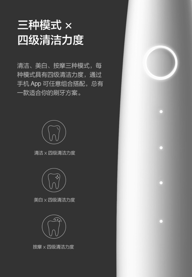 为了保持简约的设计感,这款牙刷仅在正面设计了一枚按键,功能上除了电源开关外,长按的话还可以调整牙刷的清洁力度。