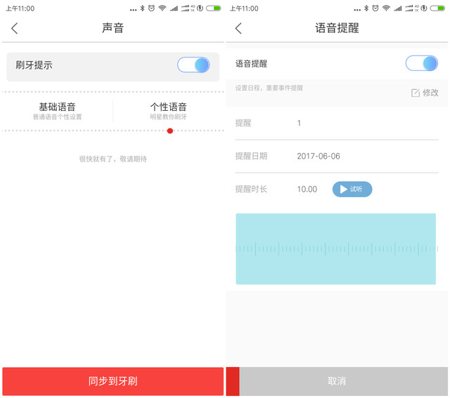 由于牙刷底部拥有音箱所以用户可以设置刷牙提醒,刷牙提醒的声音包括基础语音、个性语音和自己DIY语音多种模式。