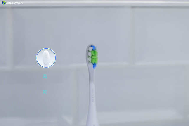 而且背面还加入了用来清洁舌苔的柔软刷头,一头两用比较方便。细心的用户可以看到刷毛被分成了三种颜色,其中蓝色部分是德国Pedex 提示型褪色毛、绿色部分是德国Pedex 钻石刷毛、白色部分是DuPont™ Tynex® Brilliance 钻石刷毛。