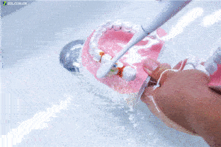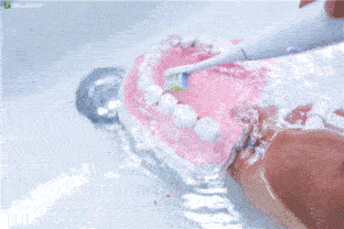 欧可林Oclean one电动牙刷在最高档位的振幅可以做到42000次/分钟,通过刷毛的高频摆动可以通过水流来冲击齿缝中的食物残渣,达到更彻底的清洁效果,我们用假牙和番茄酱模拟齿缝中残留物来进行齿缝清洁测试,通过测试我们来看看这款牙刷能否对齿缝有深度清洁的效果。