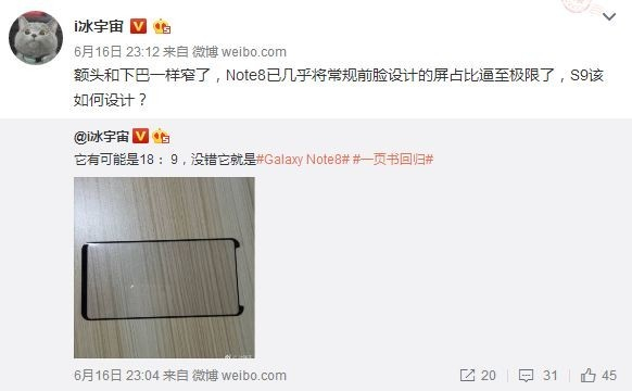 根据网友@i冰宇宙放出的消息,三星Note8依然采用类似S8系列的全视曲面屏设计,屏幕比例为18:9,但从下巴和额头的宽度来看,Note8的屏占比将会比S8系列更进一步,预计显示效果也会非常震撼。