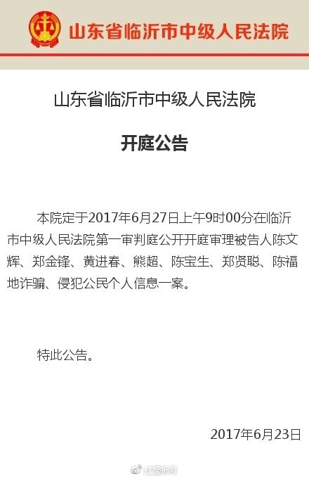 23日,山东省临沂市中级人民法院发布公告称,27日上午9时公开开庭审理被告人陈文辉、邓金锋等7名被告诈骗、侵犯公民个人信息一案。