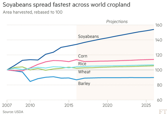 大豆已深入到巴西内陆大草原地区、阿根廷的草原以及美国农村腹地。过去一年的大豆收成,足以给巴西和美国的经济带来明显提振。美国农业部(USDA)预测,未来10年,这种油籽将推动全球农作物种植面积超过10亿公顷(1000万平方公里),增速超过大麦、玉米、棉花、大米、高粱或小麦。
