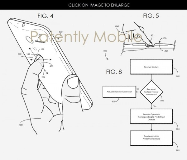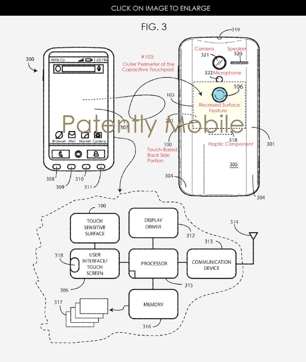 此外机身背面触控区域,用户可以手势来快速访问某些设置和应用。例如,用户在主屏幕上在机身背面画“C”就能关闭/开启WiFi功能等等。这项专利于1年前就提交了申请,但直到最近才得到美国商标和专利局审批通过。
