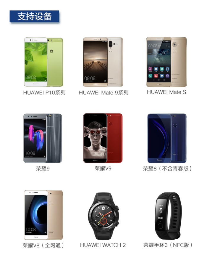 为了让更多的用户享受到便捷的手机支付服务,除了不断增加支持银行的数量,Huawei Pay同时也在增加适配的终端。目前支持Huawei Pay支持的设备已经达到12款,包括:HUAWEI P10系列、HUAWEI Mate 9系列、荣耀9、荣耀V9、荣耀8(不包含青春版)、荣耀V8(全网通)、HUAWEI Mate S、HUAWEI WATCH2、荣耀手环3(NFC版)。