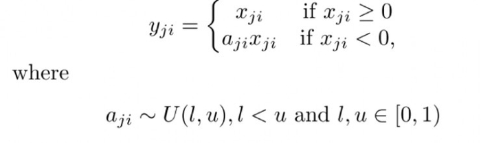 “随机纠正线性单元”RReLU也是Leaky ReLU的一个变体。在RReLU中,负值的斜率在训练中是随机的,在之后的测试中就变成了固定的了。RReLU的亮点在于,在训练环节中,aji是从一个均匀的分布U(I,u)中随机抽取的数值。形式上来说,我们能得到以下结果: