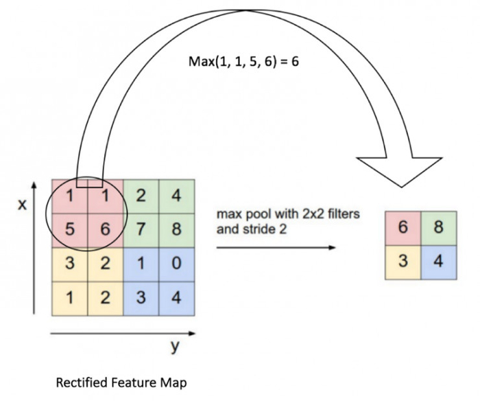注意:这里我们把2 x 2窗口移动了两个单元格,然后取每个区域的最大值。