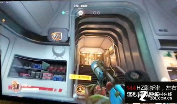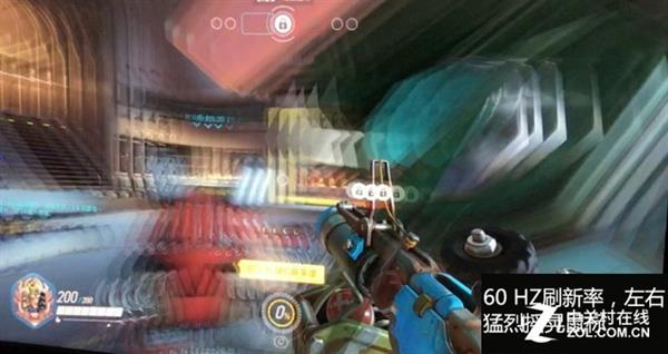 《守望先锋》,上面是60Hz,下面是144Hz。开场机舱里面快速左右晃动,感觉60Hz明显就是画面刷新不够快,画面都是瞬间糊起来的状态。