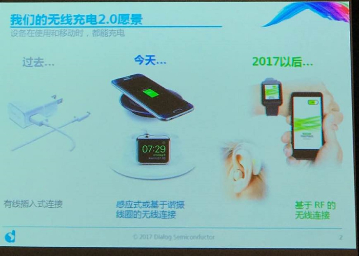 近日,高度集成电源管理、AC/DC电源转换、充电和蓝牙低功耗技术供应商Dialog半导体公司与Energous联合推出了下一代RF无线充电解决方案–WattUp。该技术包括了DA4100功率发射器和DA2200、DA2210无线充电接收器;用小型、低成本的天线替代目前较大的线圈,并能够在4.5米范围内成功采集RF能量,实现对设备的充电。