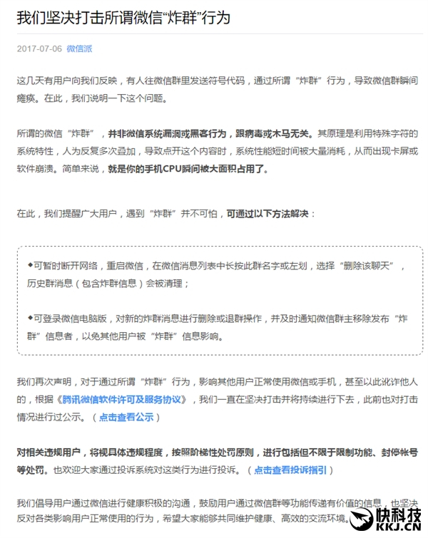 此外,微信还表示,对于通过所谓“炸群”行为,影响其他用户正常使用微信或手机,甚至以此讹诈他人的,将坚决打击并将持续进行下去。