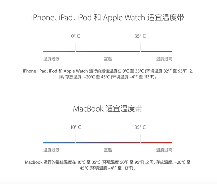 2. 远离极端温度根据苹果的官方文档,16°C 至 22°C 是理想温度带,长期在超出 35°C 的环境下使用电子设备,可能会对电池造成永久损坏,严重者可能会出现充不满电的现象。