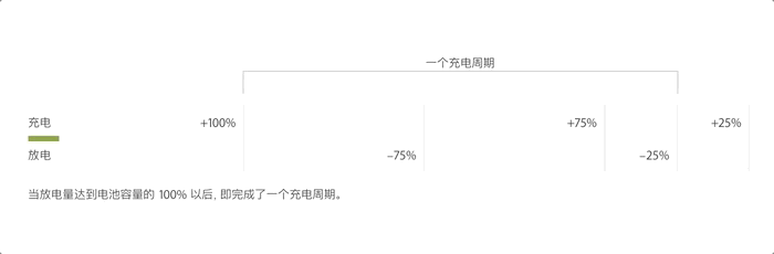 举个例子,我们晚上睡觉时将手机充满电,第二天用掉了 75% 的电量,接着再充满电,之后拔下电源又用了 25% 的电量,这时就完成了一次「充电周期」。完成一个「充电周期」后,手机电池的最高电量才会减少一点。