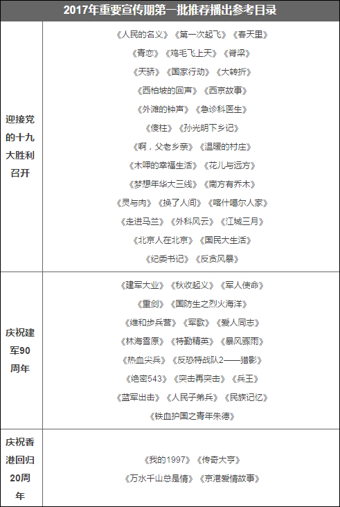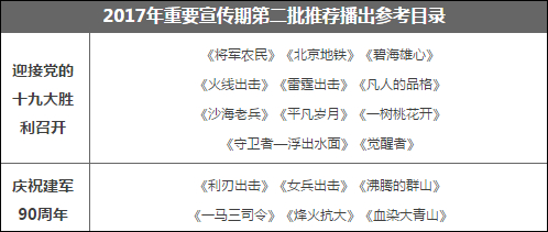 7月5日,国家广电总局下管微信号“广电时评”发布文章,为了迎接十九大胜利召开、庆祝建军90周年,广电总局发布《国家新闻出版广电总局电视剧司关于下发2017年重要宣传期第二批推荐播出参考剧目的通知》(以下简称《通知》),对重要宣传期的重点电视剧创作播出工作进行安排。