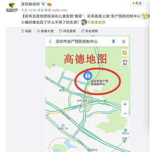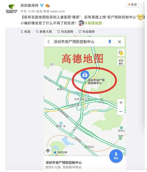 更有趣的是,百度地图和莆田系有勾结的证据没找到,反倒是“深圳新闻网”小编在高德地图上发现,高德地图竟标注出“深圳市丧尸预防中心”的地址,让人哭笑不得。