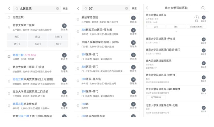 一位网友表示“上百度搜罗了一圈,各种医院都试了一遍也没发现类似问题。”而在他的截图中可以看到,像“北京大学深圳医院”“北医三院”“301医院”这样的检索结果中,百度地图不仅在第一条准确展现医院地址,还在下方提供了部分关联内容以供用户选择,在很多用户使用模糊关键字搜索的情况下,这恰恰是百度地图相较“搜什么只显示什么“的笨地图的优势之处。