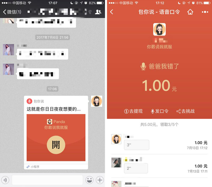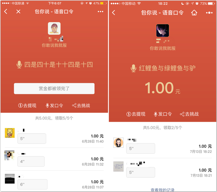 值得注意的是,这款小程序自带语音识别功能。只有当所说语音与口令一致时,才能成功领到红包。这样,就不用担心你的红包被白白领走啦。