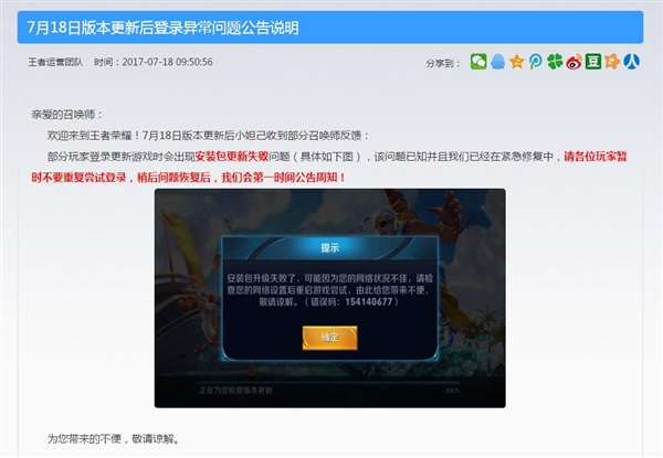 以下是“7月18日版本更新后登录异常问题公告说明”