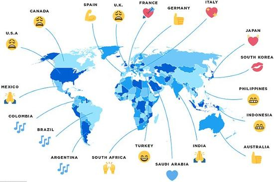 为了庆祝这一天,推特分析了全球用户的表情包使用情况。澳大利亚的推特用户们很乐观,他们最喜欢竖起大拇指的表情。但是让人非常吃惊的是,德国人也喜欢使用这个表情,尽管他们经常给人以很严肃的印象。南非人喜欢使用一双手的那个表情,而西班牙人则更喜欢展示肌肉的表情。 印度和墨西哥的人更加虔诚一些,他们更加喜欢“双手合十”的表情。