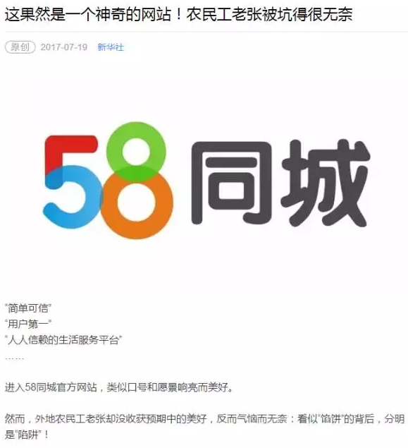 昨日,新华社微信公众号发表了一篇名为《这果然是一个神奇的网站!农民工老张被坑得很无奈》的文章,怒斥58同城的“流氓行为”,引来了网友的广泛关注。