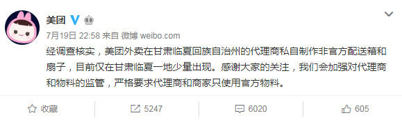 7月19日晚间,就美团外卖使用清真食品箱一事,美团官方微博发表回应,“经调查核实,美团外卖在甘肃临夏回族自治州的代理商私自制作非官方配送箱和扇子,目前仅在甘肃临夏一地少量出现。”