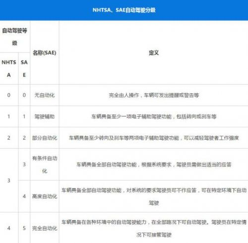 首先我们就来说说自动驾驶是如何分类的,所谓L3实际上就是Level 3,就是值得第3级别的自动驾驶,而自动驾驶是区分等级的,不同等级实现的功能和自动程度不一样。目前全球范围内比较认可的有两个分级分别是NHTSA和SAE自动驾驶分析规则,在国内和厂商宣传当中使用最多的其实还是SAE自动驾驶分级。