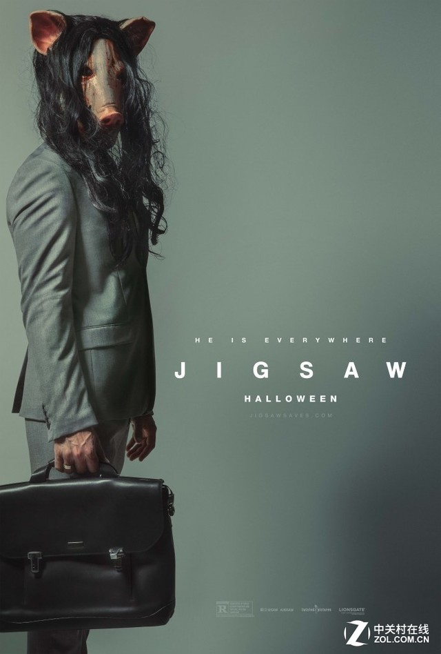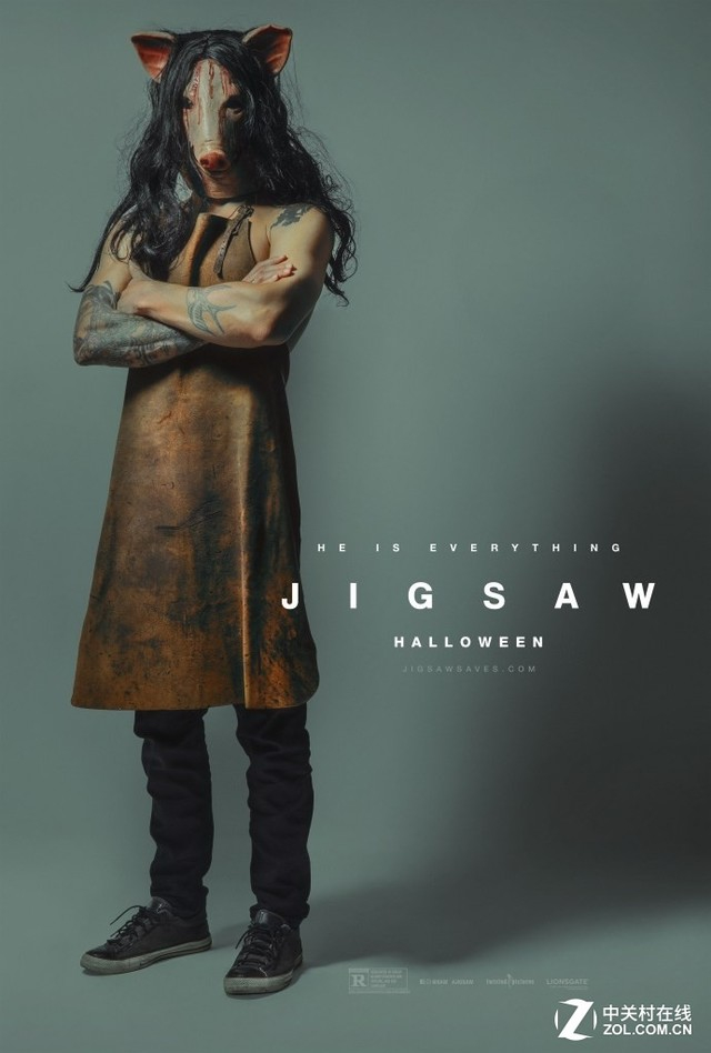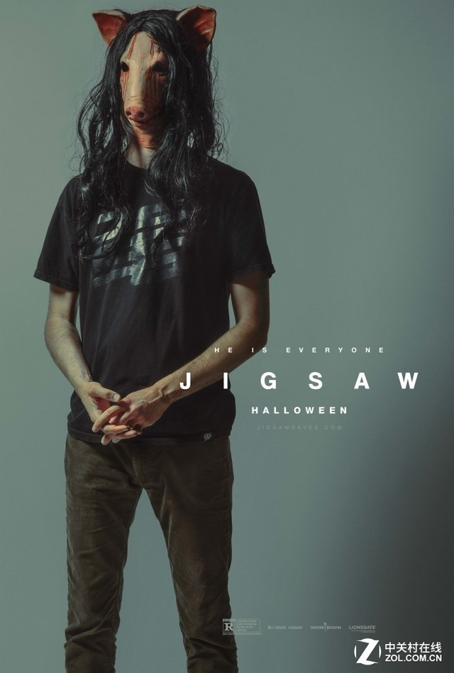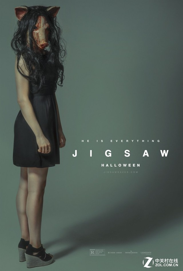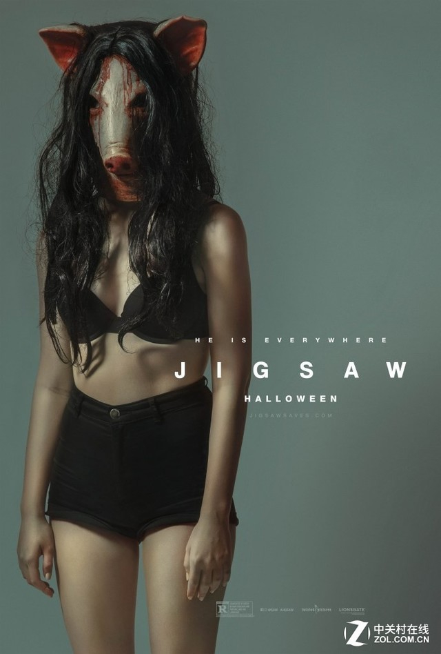 《电锯惊魂8》诡异海报 妹子戴猪头面具