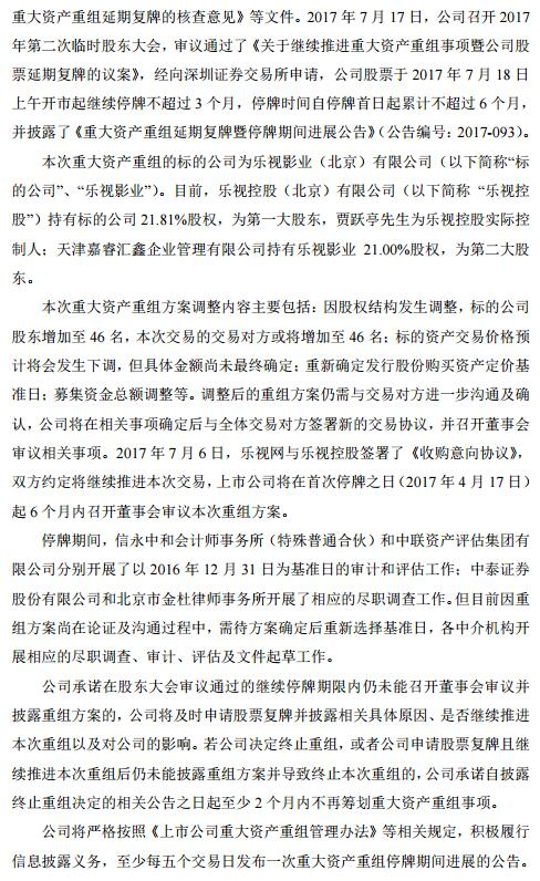 本次重大资产重组方案调整内容主要包括:因股权结构发生调整,标的公司股东增加至 46 名,本次交易的交易对方或将增加至 46 名;标的资产交易价格预计将会发生下调,但具体金额尚未最终确定;重新确定发行股份购买资产定价基准日;募集资金总额调整等。调整后的重组方案仍需与交易对方进一步沟通及确认,公司将在相关事项确定后与全体交易对方签署新的交易协议,并召开董事会审议相关事项。2017 年 7 月 6 日,乐视网与乐视控股签署了《收购意向协议》,双方约定将继续推进本次交易,上市公司将在首次停牌之日(2017 年 4 月 17 日)起 6 个月内召开董事会审议本次重组方案。