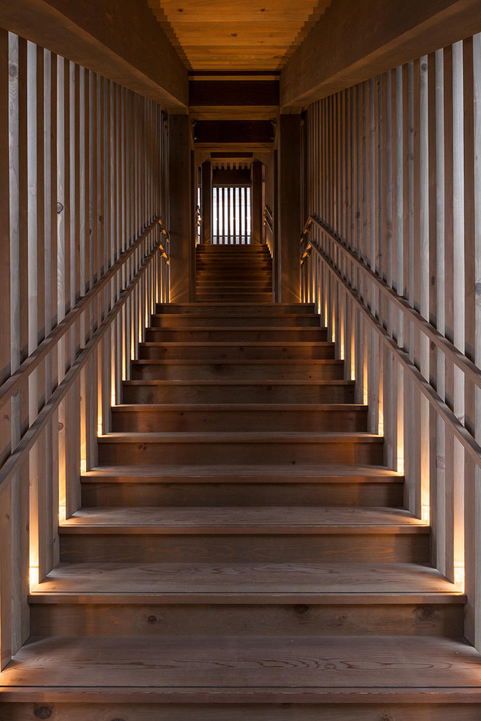 手冢贵晴给出的答案是,直接在缓坡上做建筑,并利用木头嵌合的技术,把新旧建筑连接在一起。