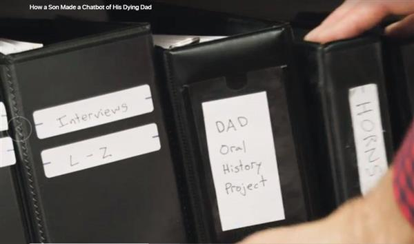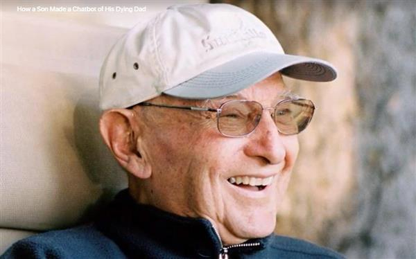 2016年,Wired作者James Vlahos的父亲查出肺癌晚期,他为了留下永久的纪念,遂邀父亲进行了总计长达9万多字的录音,然后在家人的支持和帮助下“赶制”出了一个名为Dadbot的聊天机器人。