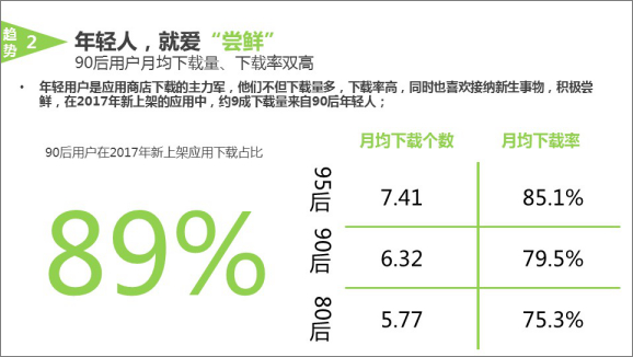 90后年轻用户成为移动互联网主力军已经是事实了!360手机助手发布的报告显示,年轻用户成为了应商店下载的主力军,他们不但下载量多、下载率高,同时也喜欢接纳新生事物。积极尝鲜的他们,下载了2017年新上架应用的近9成。