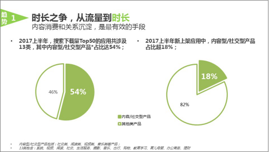 在诸多APP中,内容行和社交型产品风头正劲。报告显示,2017年上半年搜索下载量Top50(共涉及13类)中内容型、社交型产品占比达54%。与此同时,在2017年新上架的应用中,内容型、社交型产品占比也超过了18%。由此可见,无论是用户搜索下载方面,还是APP创业方面,内容型和社交型产品都已成为风口。
