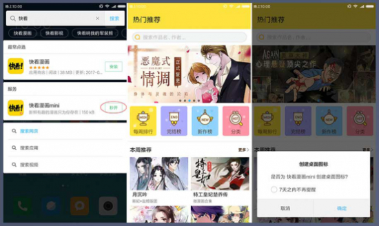 比如我们要用快看漫画客户端,但又没有安装它的APP,只需要在全局搜索框输入要查到的App名,很快MIUI 9便会给出搜索结果。在结果栏还提供了“秒开”按钮,点击后不需要进入App直接便可以使用快看漫画。即便是我们此前的手机中没有安装此App,MIUI 9的直达服务功能同样可以正常使用该App,不需要下载安装,对手机的存储压力大大减小。