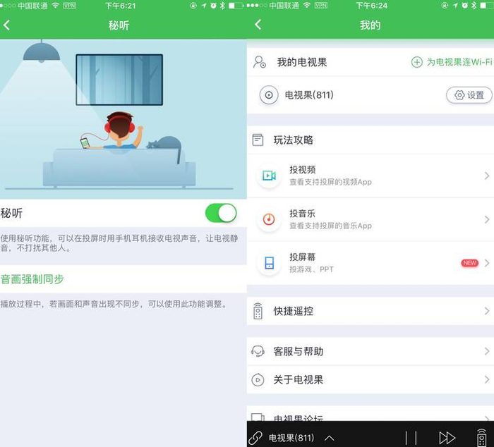 而且电视果还新增了一个「秘听」功能,可以把手机当成音频接收器,这样电视就会静音,不打扰到其他人,可是我的 iPhone 没有耳机孔,心塞…