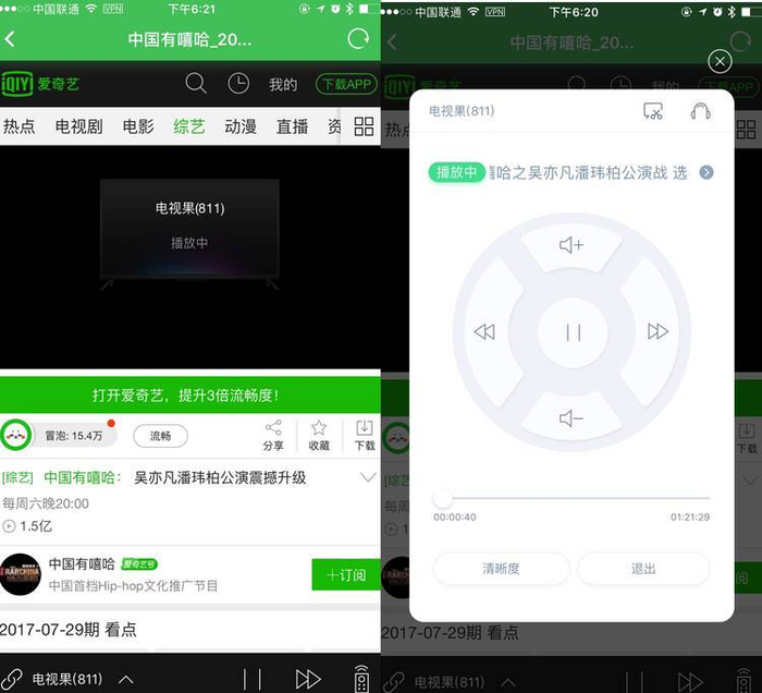 当内容在电视果上面播放的时候,手机是不用前置这个 APP 窗口的,可以继续聊天,刷微博什么的。当然你如果想调控电视播放的内容,APP 里还内置了一个遥控器,可以增减音量、快进后退、更改清晰度。