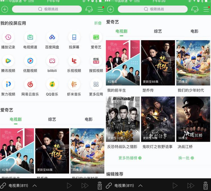 由于是简配版的电视盒子,所以没有配备专门的遥控器,操作基本都是用手机对应的 APP 完成的。APP 的界面很简单,涵盖了目前主流的网络媒体以及百度网盘,而且不用二次跳转到这些视频 APP 里,电视果本身就做了一些适配,搜索内容后就能一键播放。
