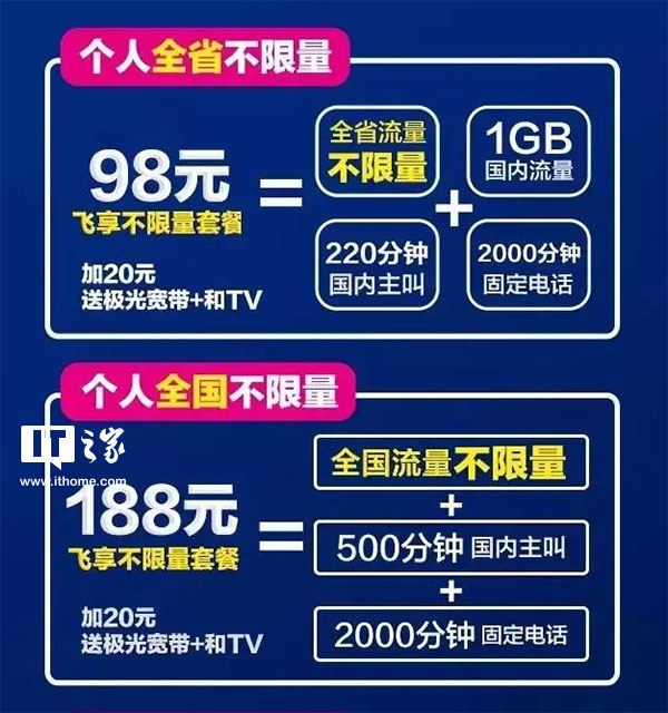 188元档为个人全国不限量,包含全国流量不限量、500分钟国内主叫和2000分钟固定电话,同样也是加20元送极光宽带+和TV。