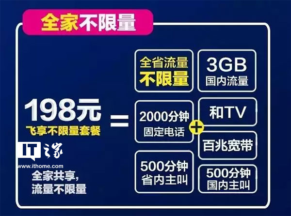 198元档为全家不限量套餐,包含全省不限量流量和3GB国内流量,还有2000分钟固定电话以及百兆宽带+和TV,还有500分钟省内主叫和500分钟国内主叫。流量可以全家共享。