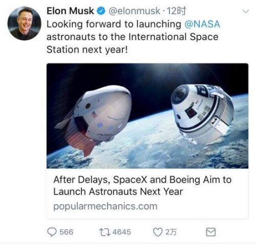 当地时间8月4日,马斯克在自己的推特账号上转推了一篇媒体文章并评论到,非常期待明年能将NASA的宇航员送到国际空间站。 马斯克预测,人类将在2020年左右登陆火星。美国宇航局给出的人类登陆火星时间则是:2030年。在接受《万古杂志》(Aeon Magazine)采访时,马斯克直言不讳地批评说,美国宇航局对登陆火星的预想时间“有些悲观”。