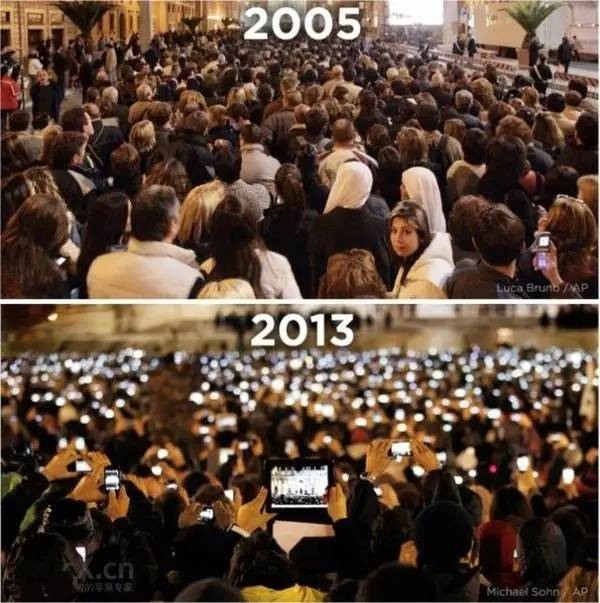 下图的 照片是 2005年在新教皇本尼迪克十六史上任时拍摄的,那时还没有iPhone;等到2013年,密密麻麻的人群中大家都在使用自己手中的设备记录这一时刻。