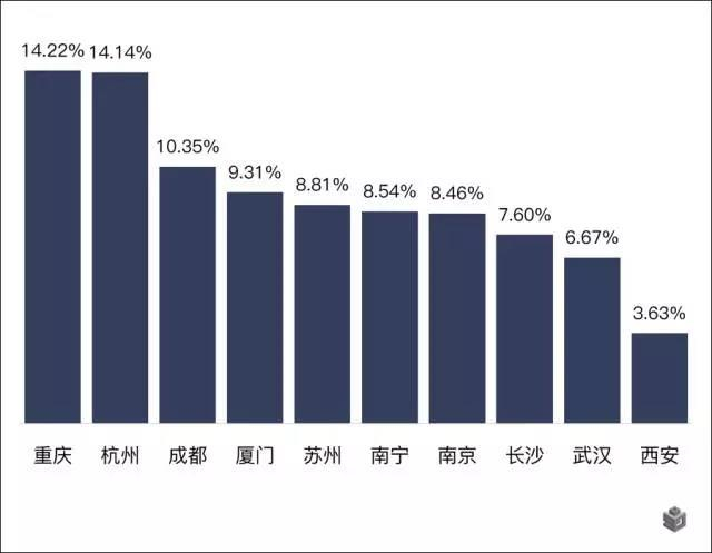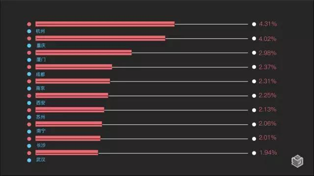 从北上广深人群迁徙图和北上广深人群流入城市TOP10图可看出,逃离一线城市的人群,主要流向了重庆、杭州、成都、厦门、苏州等地。