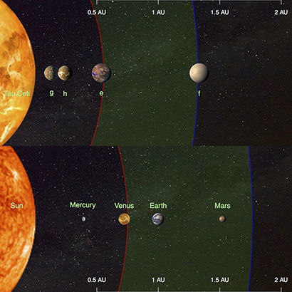 一个国际天文学家团队在类太阳恒星天仓五发现四颗类地行星。天仓五又名鲸鱼座 τ 星,是离太阳最近的恒星之一,距离 12 光年,肉眼可以看到。发现的四颗类地行星质量最小是地球的 1.7 倍,其中两颗属于超级地球,位于恒星的宜居带,意味着其表面支持液态水。