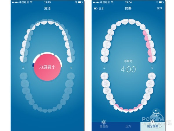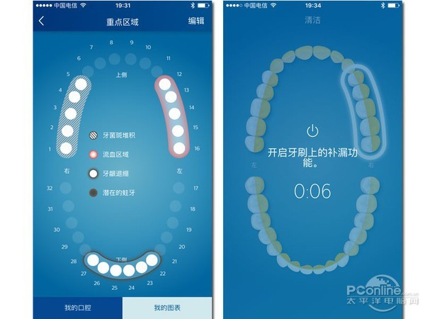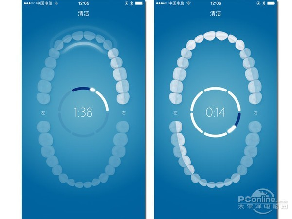 当需要清洁下一个区域的时候,APP界面会点亮对应的区域。而且,手柄也会通过震动提醒你要更换刷牙区域了。另外,2分钟刷牙时间完毕后,APP会马上根据使用者这次的刷牙情况及时制定“提醒补刷”方案。