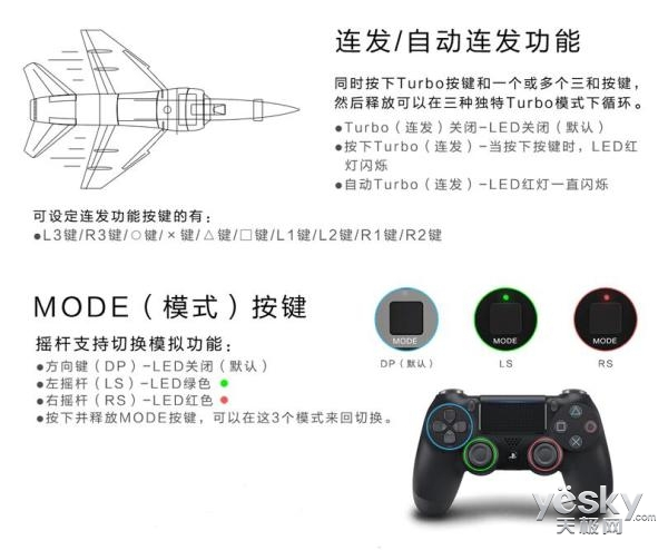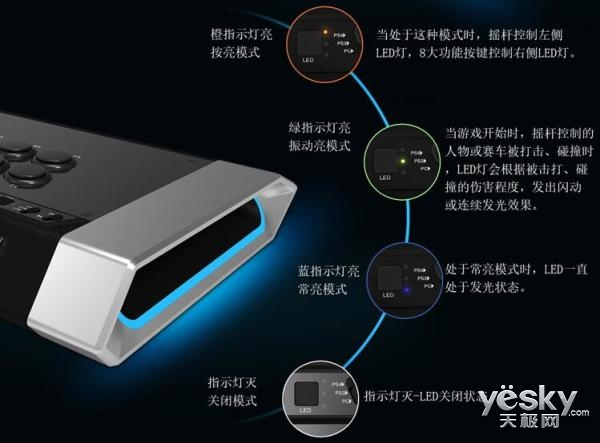 LED键不单可以控制左右两侧LED灯的明灭,还支持三种模式来选择LED灯的效果。如让左边的LED对应摇杆的操作,右边的LED对应按键的操作。或者让LED灯对应震动回馈功能,让玩家击中对方或者被对方击中的时候,LED会闪动发光灯。