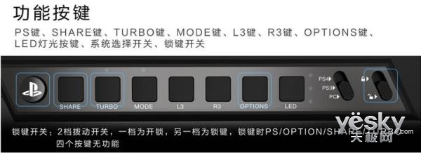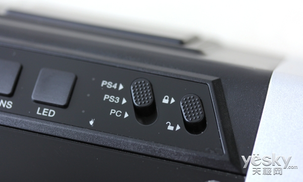 操纵台右上角一排为功能键部分。共分为七个键和两个锁定档。七个按键除了补充PS4手柄上的L3和R3外,还包括分享按键,菜单按键。除此之外模式切换键,连发键和LED灯键也囊括在内。