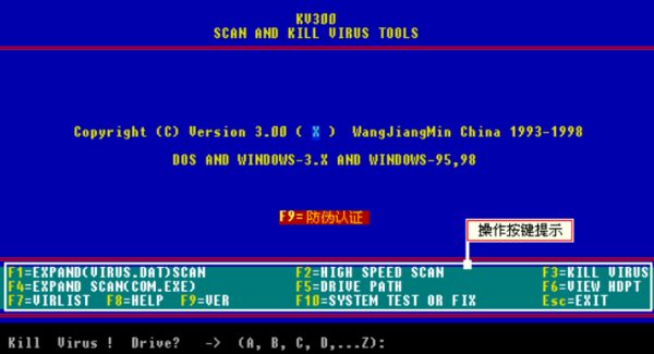 这或许是首次让人意识到,原来开发者是如此恨不得砍死盗版用户的反盗版技术。江民的KV300是90年代著名的国产杀毒软件,当时的防盗版技术普遍比较简单,软件们主要还是用CD-Key来防盗,想用盗版相当轻而易举,只要找一下流通的CD-Key或者用算号器算一下就完事了。终于,KV300的出现让很多人首次摔了跟斗,这跟斗摔得还不是一般的狠——KV300的反盗版技术甚至会让你电脑所有数据都挂掉。