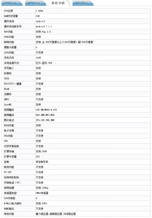 配备了5.5英寸720P也就是高清屏幕,内置2GB RAM和16GB ROM存储(应该会有更高存储容量的版本),摄像头是前置500万+后置800万像素,内置3000mAh容量电池,运行Android 7.1.1系统,将由富智康精密电子和龙旗电子代工。