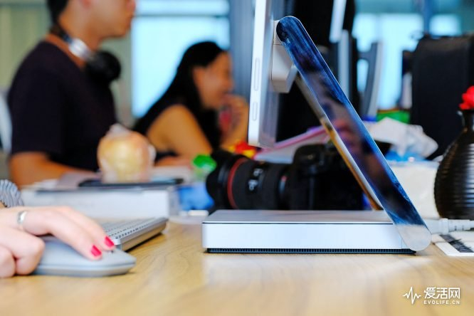 偌大的显示屏没有给屏幕组件增加太多的厚度,微软宣称使用了时尚最薄的LCD发光屏,它的厚度仅为1.53mm,屏幕的光学结构完全封装在镁铝合金机身内,因而Surface Studio的屏幕厚度仅为12.5mm,不管是从视觉上看还是实际操作,都令人感觉非常的纤薄。和iMac乐于将所有组件摆放在屏幕背后不同的是,Surface Studio将所有的计算核心都放置到了底部的底座中,进一步降低了显示部分的厚度。