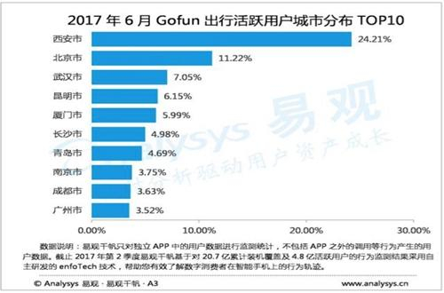 活跃用户地域分布非常集中,同Gofun布局城市具有高度的一致性,其中一线城市活跃用户占比达到77.34%,而在具体城市布局方面,Top10城市合计占比达到75.19%,其中西安市活跃用户比重最高,达到24.21%。目前,Gofun出行正处于打规模的阶段,2017年下半年、2018年,Gofun出行将会继续扩张。优化商业模式,提升运营水平,加快全面布局。