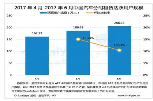 根据Analysys易观千帆监测数据显示,2017年6月,中国汽车分时租赁市场(俗称汽车共享)活跃用户达到206.33万,环比增长10.53%。汽车分时租赁自2011年在中国起步,各运营企业不断探索,小规模进行测试,打磨商业模型,积累运营经验。经历6年多时间,汽车分时租赁模式市场接受程度逐渐提高,商业模式逐渐成熟,资本关注度明显提升。