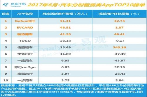 2017年6月,在汽车分时租赁TOP10榜单中,Gofun出行以51.31万人的月活用户规模位居榜首,EVCARD、盼达用车分别以48.51万人、41.26万人的月活用户规模位列榜单第二、第三位。
